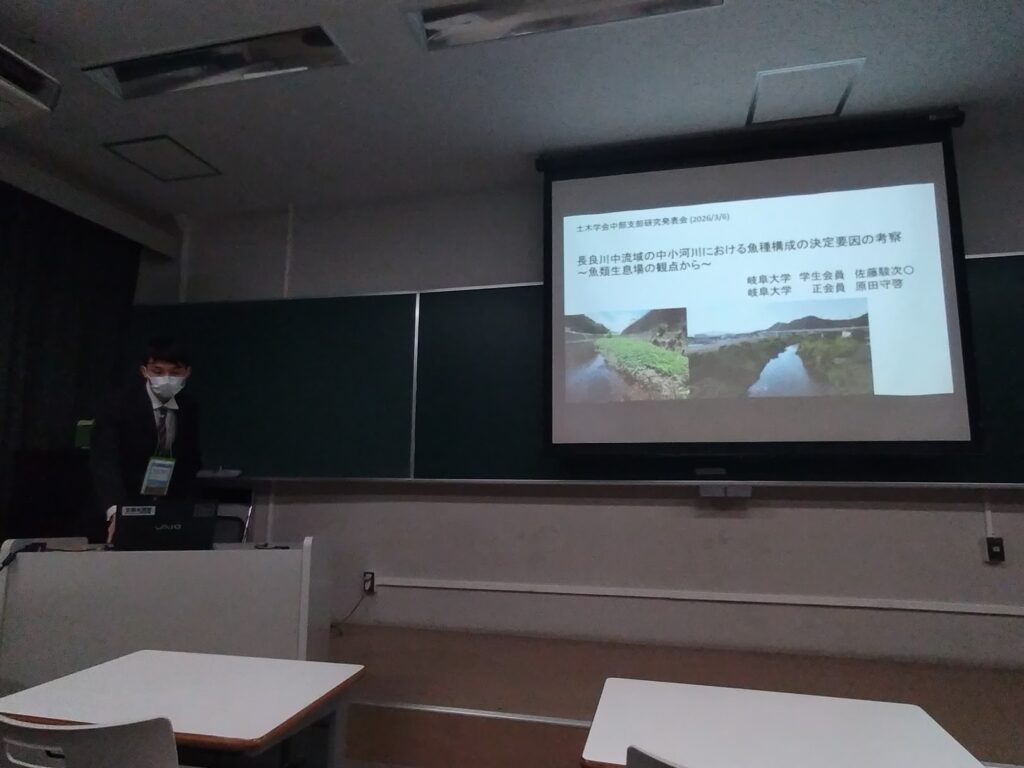 佐藤駿次,原田守啓:長良川中流域の中小河川における魚種構成の決定要因の考察~魚類生息場の観点から~,令和7年度土木学会中部支部研究発表会,2026年3月6日,岐阜大学